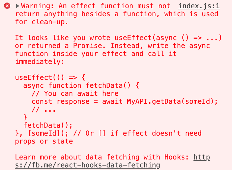 바로 이렇게 이펙트를 익명 함수로 선언하고 함수 본문에서 async 함수를 호출하는 것인데요, 이러면 async 함수가 프라미스를 반환하더라도 이펙트는 아무것도 반환하지 않아 클린업으로 이상한 값을 넘길 우려가 사라집니다! 😄