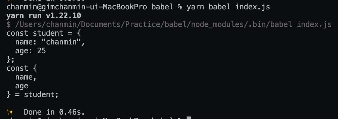 이제 다시 yarn(또는 npx) babel index.js 를 실행하면, 다음과 같이 분해 할당 문법의 트랜스파일이 완료됩니다.