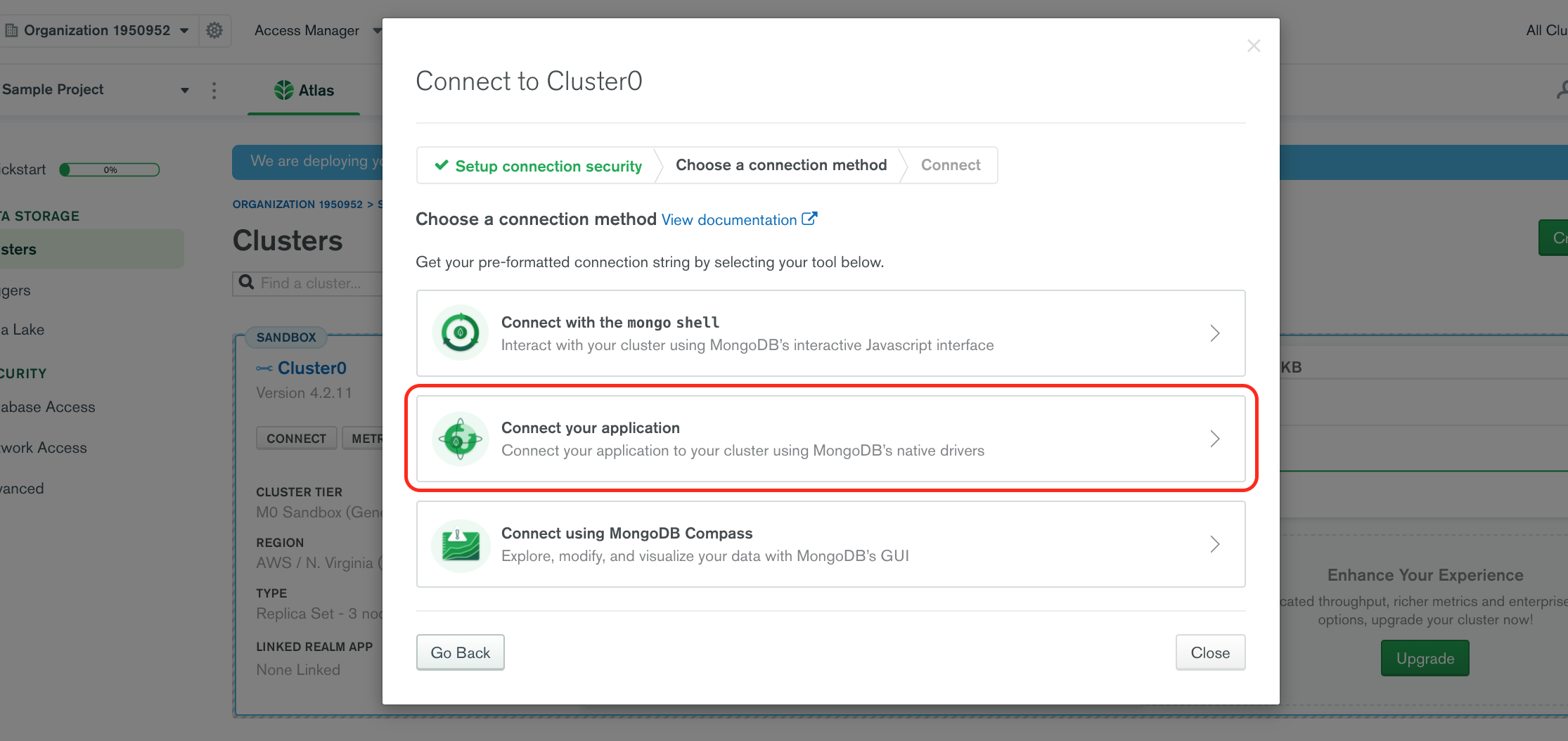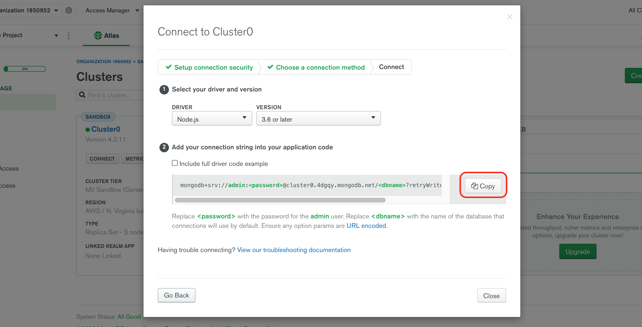 세 가지 연결 방법 중 [Connect your application] 을 선택한 후 나타나는 URI를 복사해둔다.