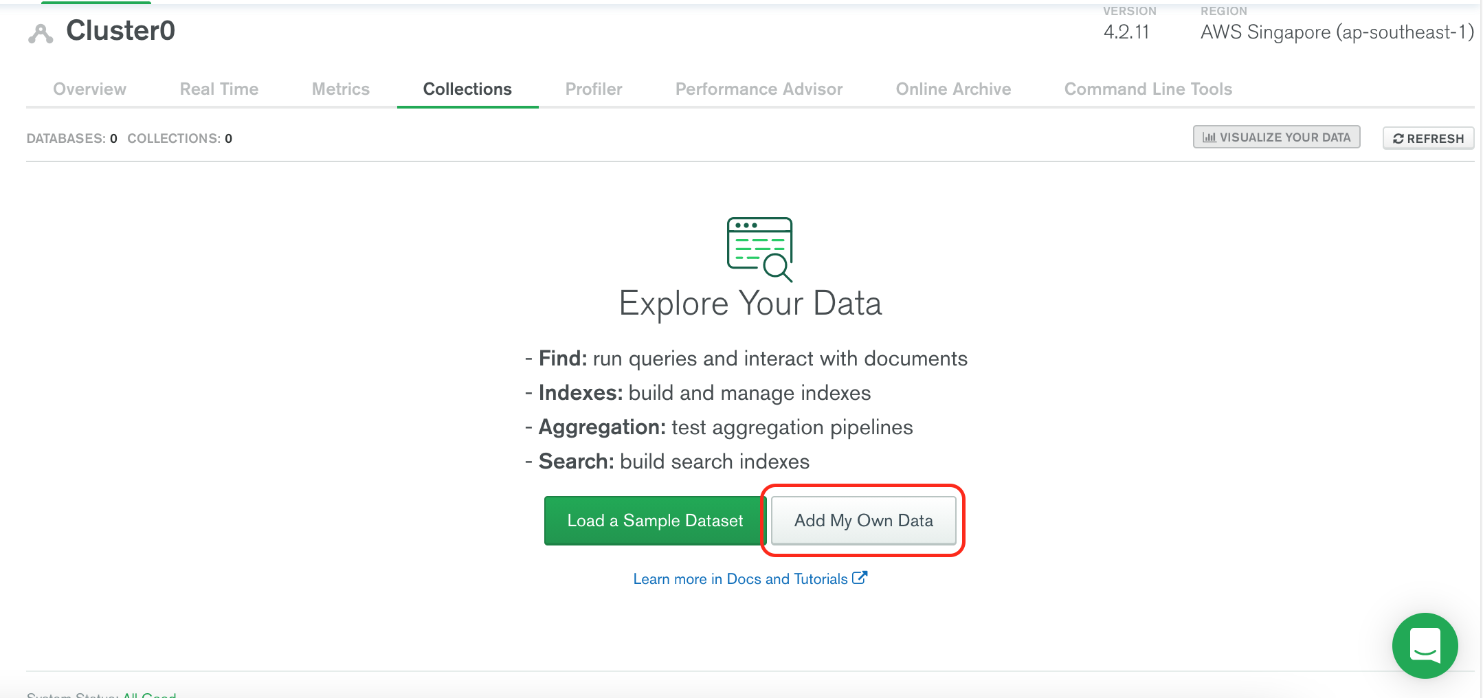 이제 [COLLECTIONS] 를 선택해 실제 데이터베이스를 생성할텐데, [Add My Own Data] 를 눌러 데이터베이스의 이름과 하위 분류(컬렉션) 의 이름을 정해준다. 데이터베이스의 이름은 Node.js와의 연결을 위해서 필요하니 기억해 두자. (컬렉션 이름이 아니다!)