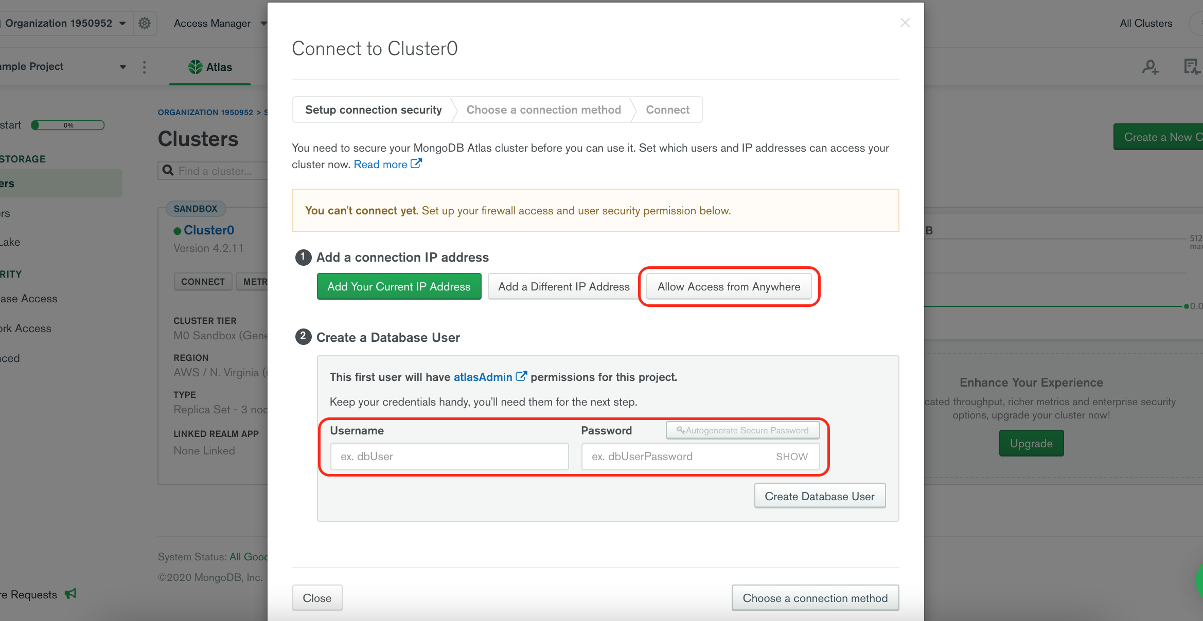 그럼 이런 설정 화면이 나타나는데, [Allow Access from Anywhere] - [Add IP Adress] 를 선택한 다음 사용자 정보를 입력한다.