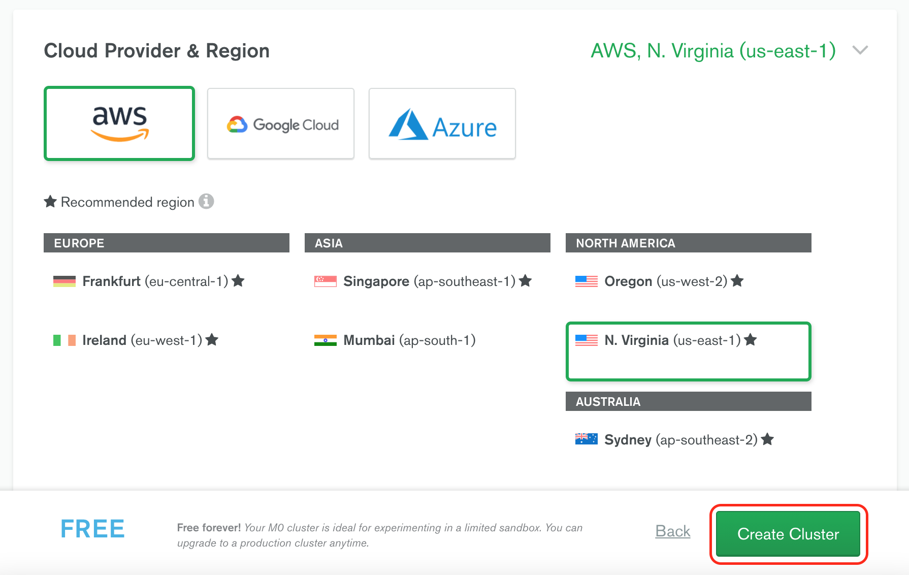 사용량에 따라 플랜을 선택한 다음 서비스 제공자는 AWS로 설정한 다음, 하단 배너의 [Create Cluster] 버튼을 클릭하면 DB를 사용할 가상 환경이 구축된다. (이때 약 2~5분의 시간이 소요되니 합법적으로 쉬다 오자.)