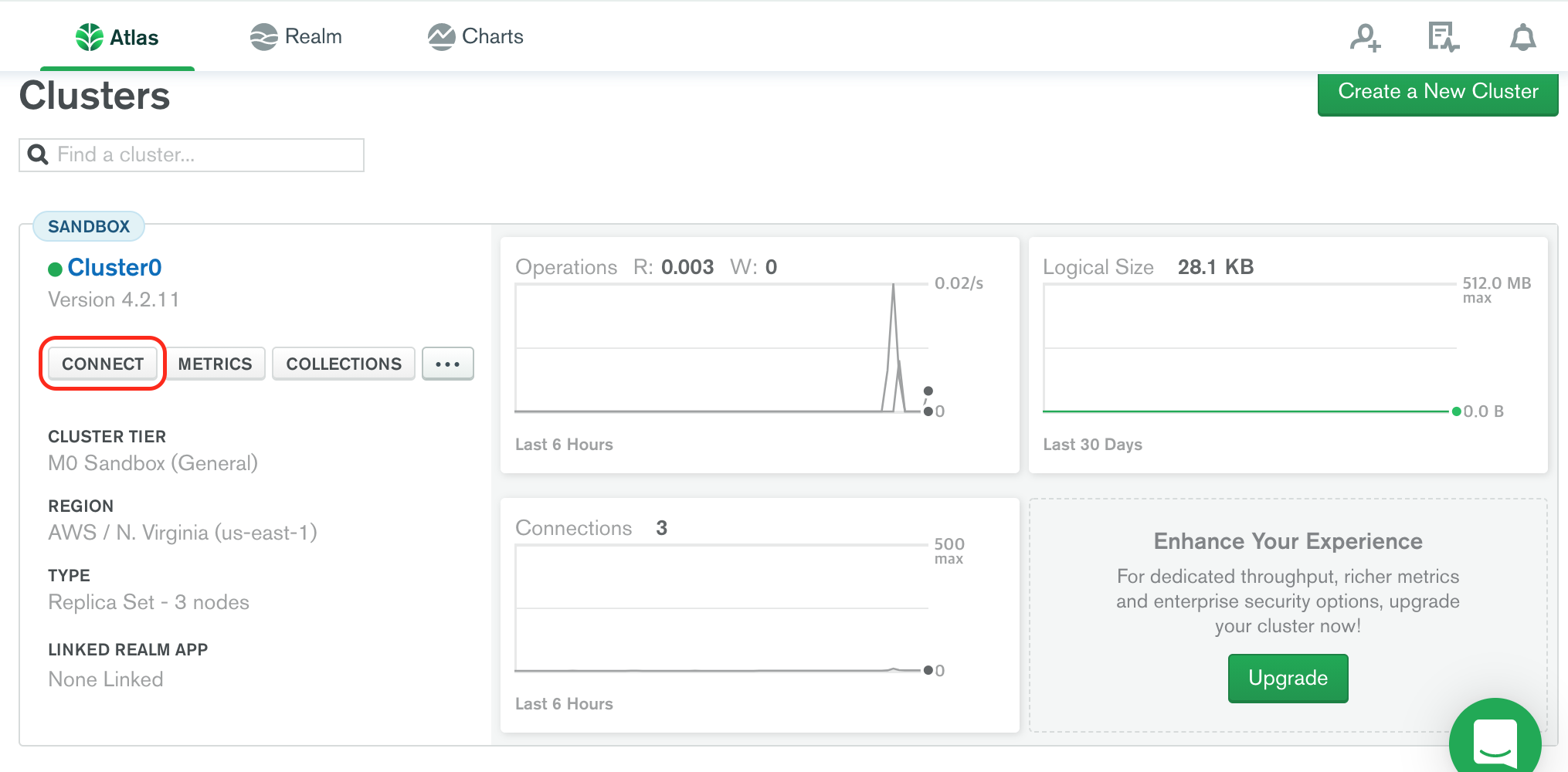 클러스터 대시보드로 돌아와 이번에는 [CONNECT] 를 선택해보자.