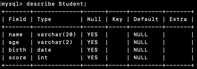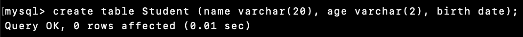 CREATE TABLE Student (name varchar(20), age varchar(2), birth date);