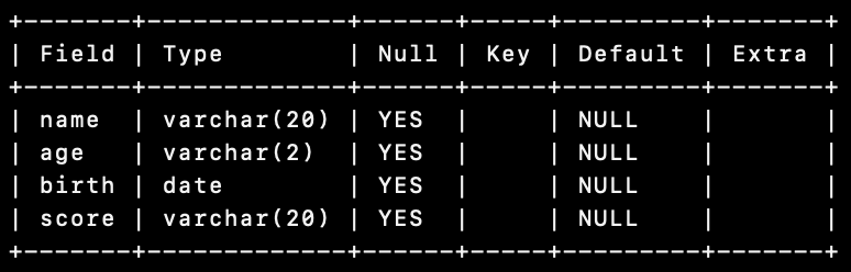 # name, age, birth 필드를 갖는 테이블을 생성합니다.