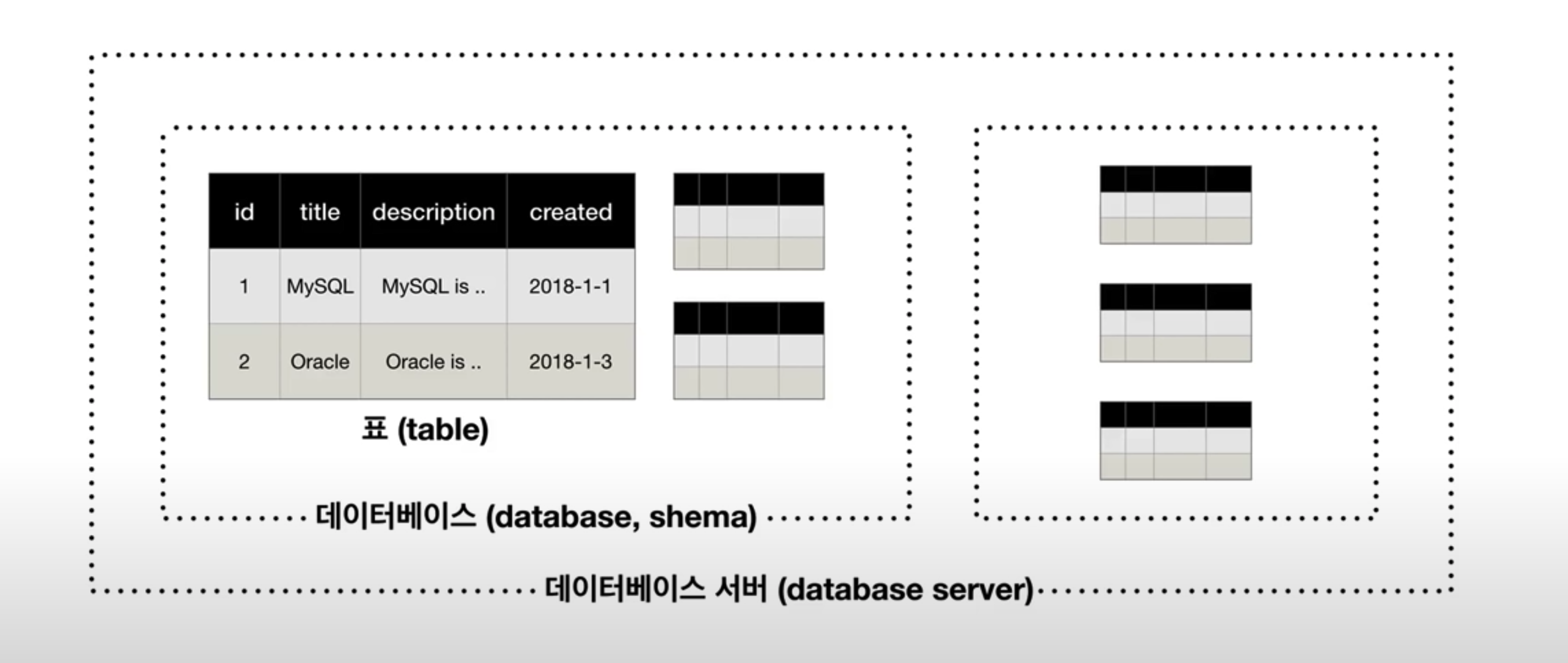 MySQL에서는 테이블과 데이터베이스에 접근하는 명령어가 모두 다르기 때문에, 테이블 ⊂ 데이터베이스 ⊂ 데이터베이스 서버 로 관계가 형성된다는 정도만 알아두시면 될 듯 합니다.