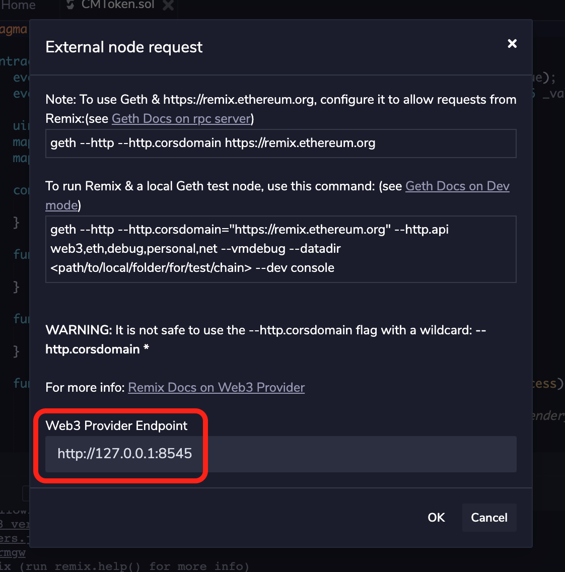 Web3 Provider Endpoint에 가나슈의 RPC Server 주소를 대입하고 OK를 누르면, 가나슈와 리믹스가 연동된 모습을 확인할 수 있습니다.