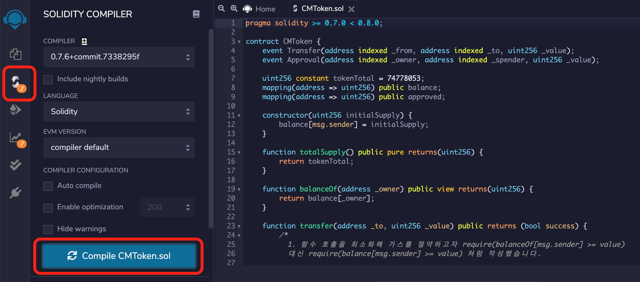 리믹스 IDE에서 컨트랙트 코드를 작성한 후, 좌측 두 번째 탭에서 컴파일을 마친 모습입니다.
