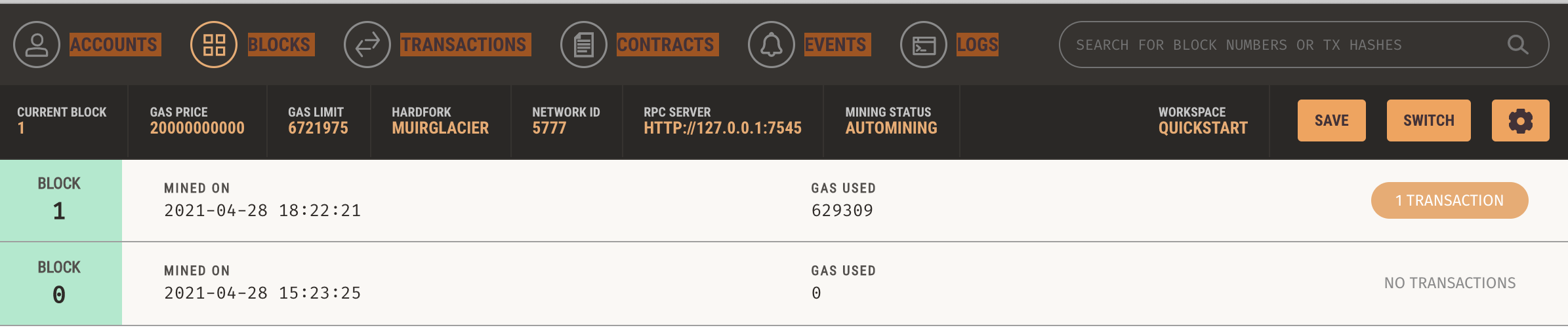 Geth에서는 트랜잭션을 생성(제출)한 후 처리하기 위해 마이닝을 직접 수행해야 했고, 블럭이나 트랜잭션 정보를 확인하기 위해 복잡한 명령어들을 암기해야 했지만 가나슈에서는 메뉴를 클릭하는 것만으로도 간단하게 정보를 확인할 수 있는 모습입니다.