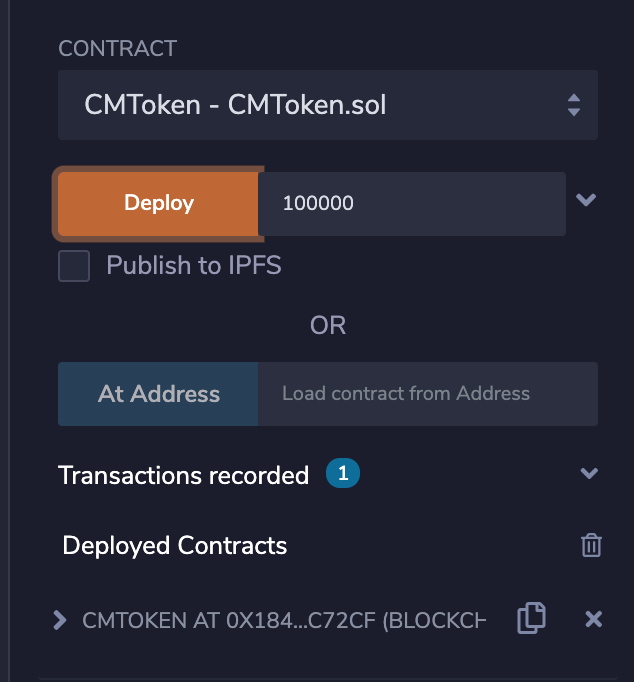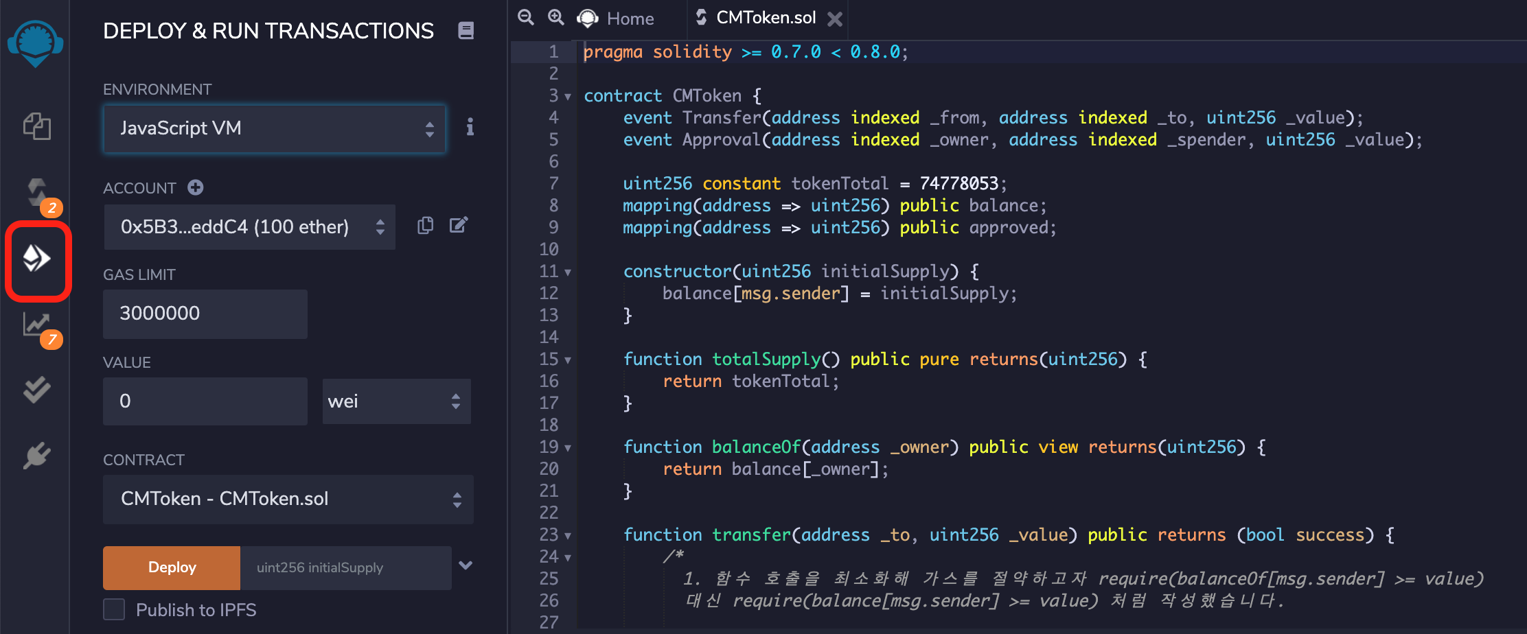 이어서 초기값(initialSupply)을 대입해 첫 번째 트랜잭션을 생성해 보겠습니다.