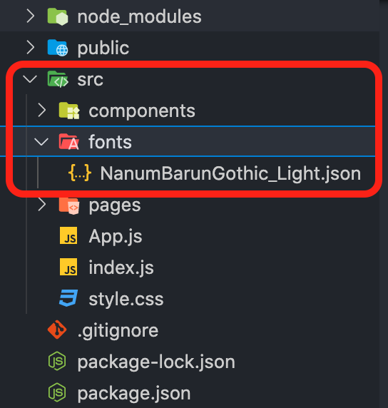 json으로 변환된 폰트를 src 폴더 내부로 옮긴 후, 다음과 같이 불러와 사용합니다.