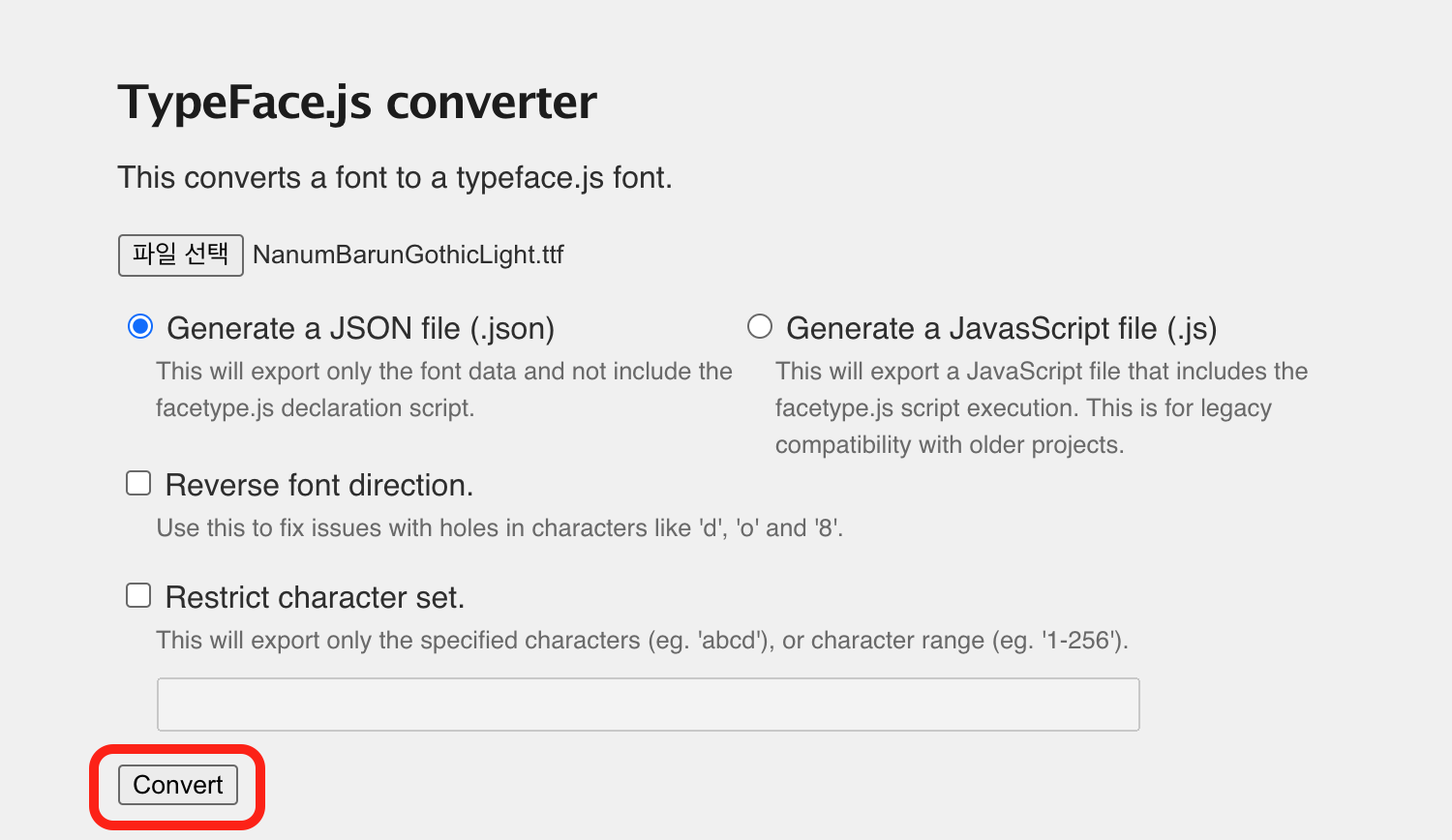 이후, gero3.github.io/facetype.js/에 들어가 다운받은 ttf 파일을 업로드하면 ttf 파일을 js나 json 포맷으로 치환할 수 있습니다.