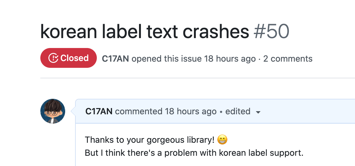 아무튼 이렇게 이슈를 남기고 답변을 받은 결과 라벨의 기본 폰트가 한국어를 지원하지 않기 때문이라는 것을 알 수 있었는데요,