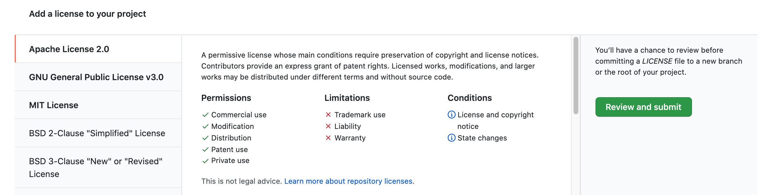 라이센스 템플릿 목록 중 원하는 용도에 맞는 라이센스를 선택한 후, 커밋을 남겨주기만 하면 끝입니다.
