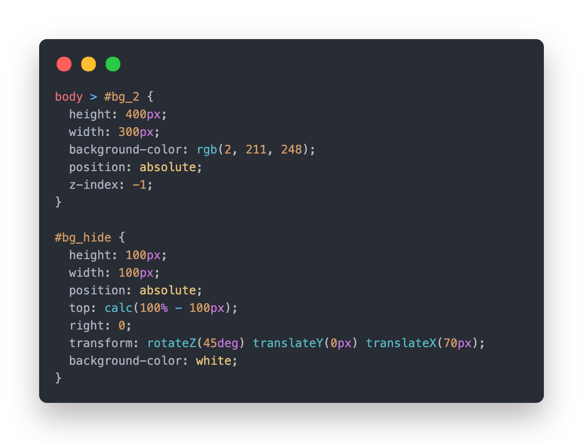 예를 들어 한쪽 귀퉁이가 접힌 사각형을 그려야 한다고 하면, 큰 사각형(하늘색)을 그린 후 흰색의 작은 사각형을 회전시켜 위에 포개는 방식으로 구현할 수 있습니다.