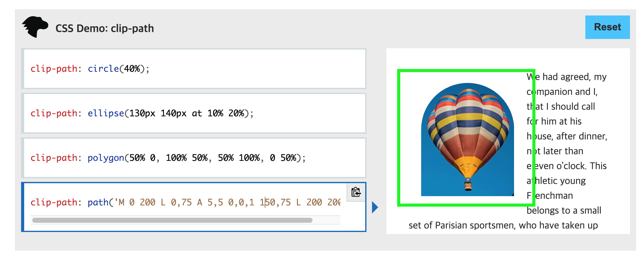 MDN 문서를 읽어보면 아시겠지만 꼭 다각형이 아니더라도 디자이너가 원하는 어떤 형태로든 요소를 클립할 수 있는데요, 다만 인자가 꽤나 많고 복잡한 편이라 제대로 사용하기 어렵다고 느끼실 수도 있습니다.