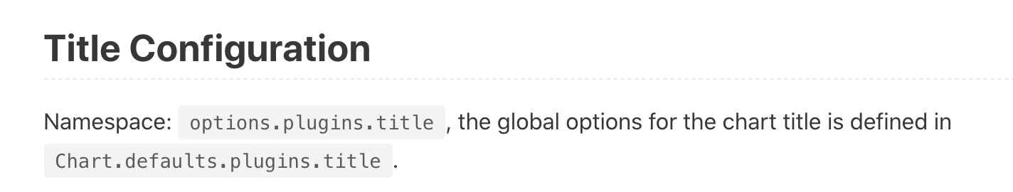 Title The chart title defines text to draw at the top of the chart. Title Configuration Namespace: options.plugins.title, the global options for the chart title is defined in Chart.defaults.plugins.title. Name Type Default Scriptable Description align stri