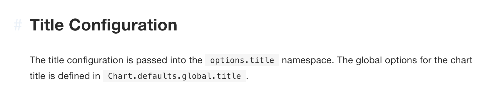 Title The chart title defines text to draw at the top of the chart. Title Configuration Namespace: options.plugins.title, the global options for the chart title is defined in Chart.defaults.plugins.title. Name Type Default Scriptable Description align stri