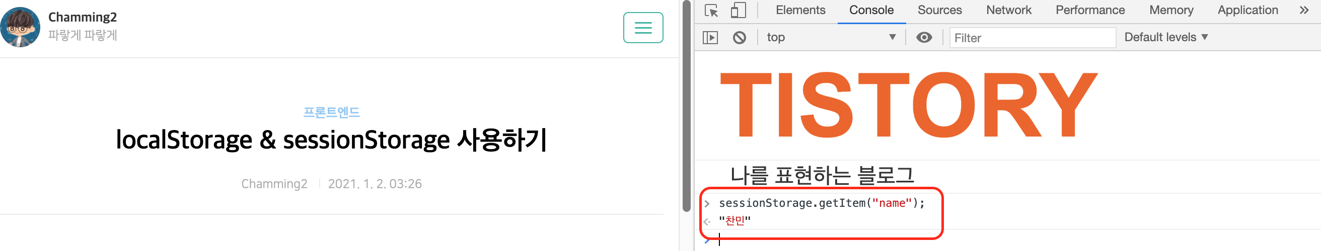새로고침을 해도 여전히 sessionStorage.getItem("name")을 통해 저장소에 접근할 수 있는 것을 확인할 수 있습니다.