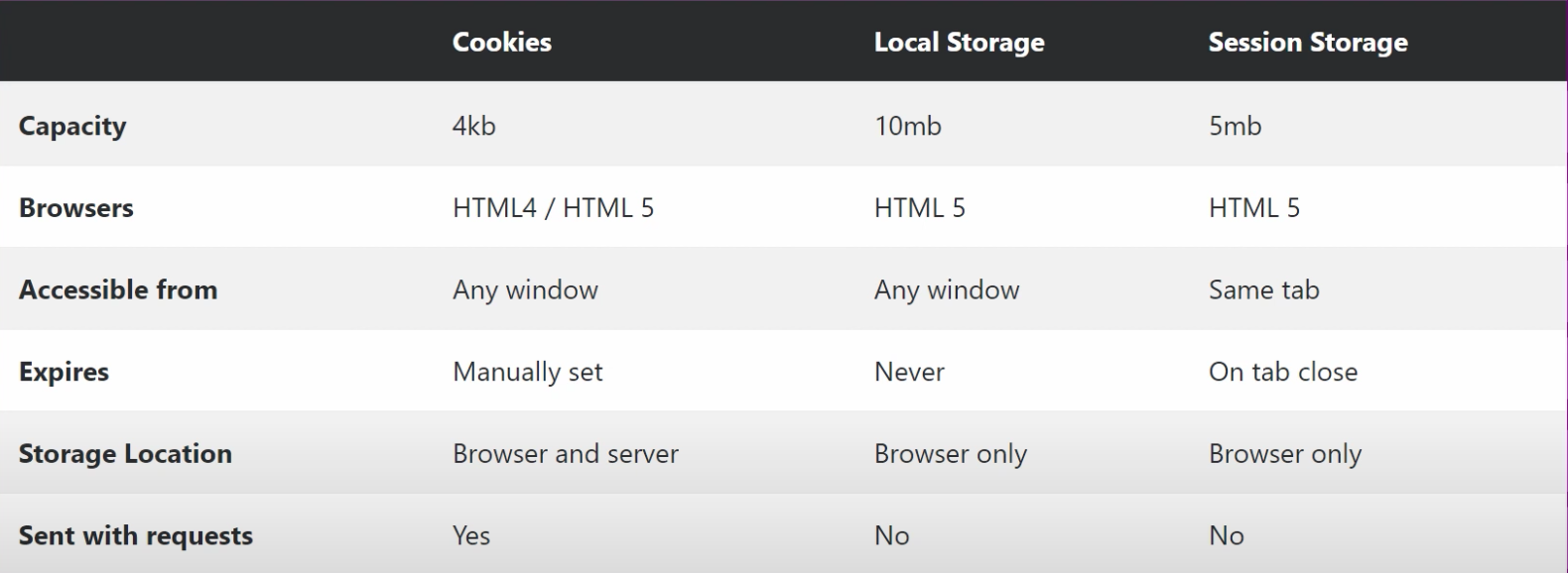 두 브라우저 저장소의 공통적인 특징으로는 쿠키와 달리 웹 서버로부터 고립되어 있다는 점입니다.