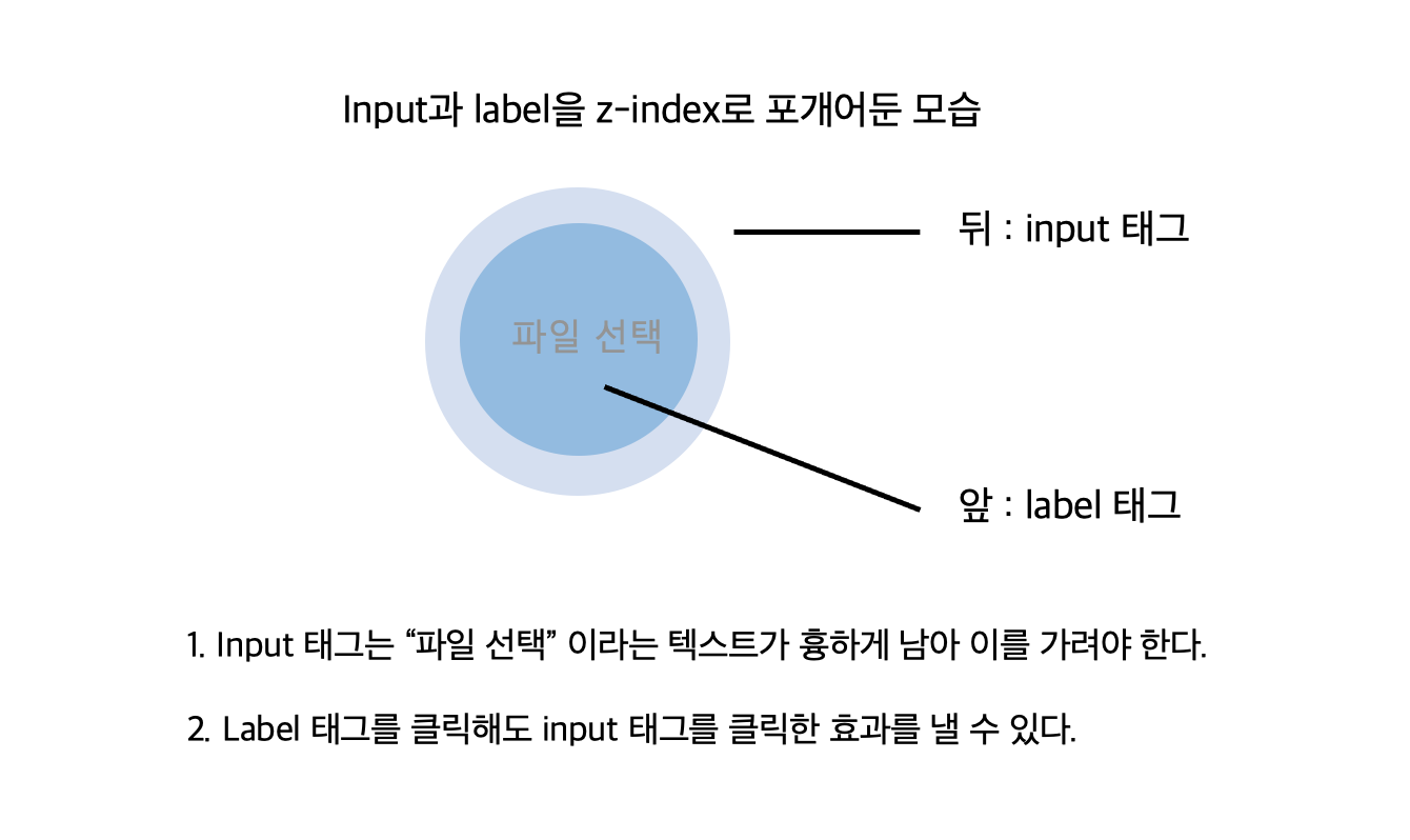 그래서 input 태그를 뒤에 두고, label 태그를 앞에 배치해 “파일 선택” 이라는 텍스트를 가리기로 했습니다.
