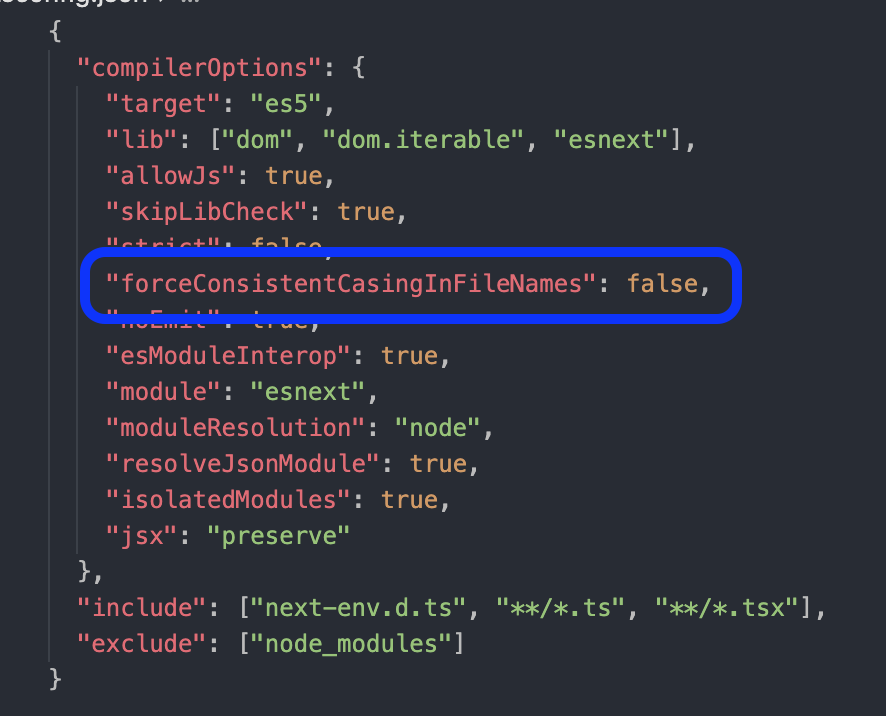 forceConsistentCasingInFileNames 옵션을 false로 설정해주면, 문제가 해결됩니다.