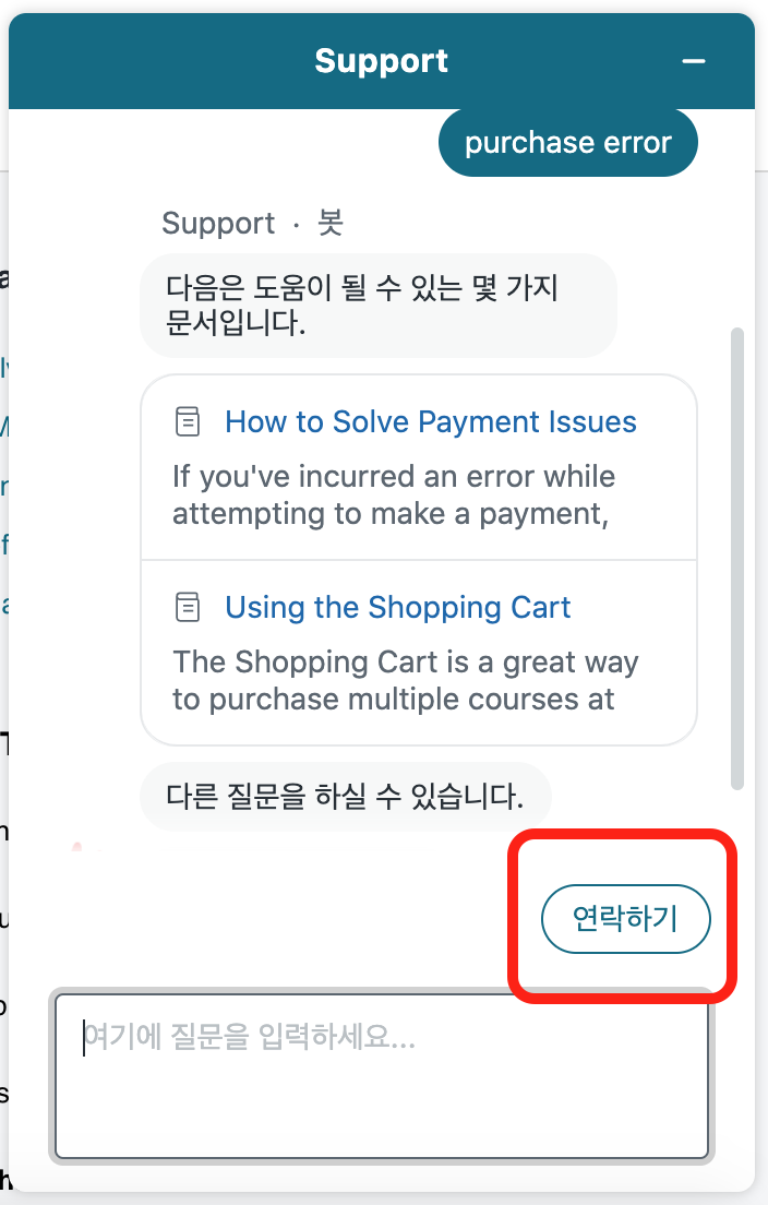 우측 하단의 [Help and Support] 를 누르면 챗봇을 소환할 수 있는데, 질문을 입력하면 [연락하기] 라는 버튼이 등장합니다.