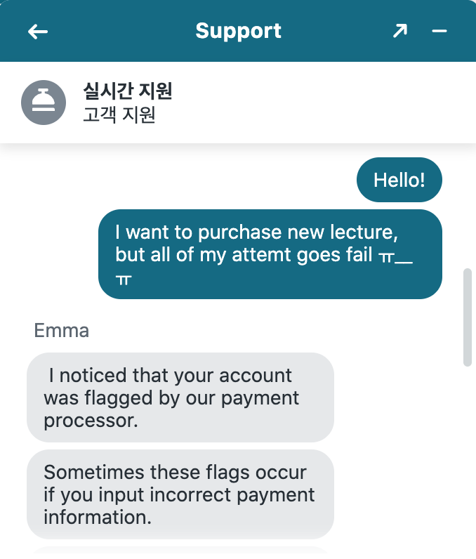 ※ 요약) 결제 실패로 인한 계정 락이 걸린 상태일 수 있는데, 이럴 경우 실시간 상담 기능을 이용하면 바로 해결할 수 있다!