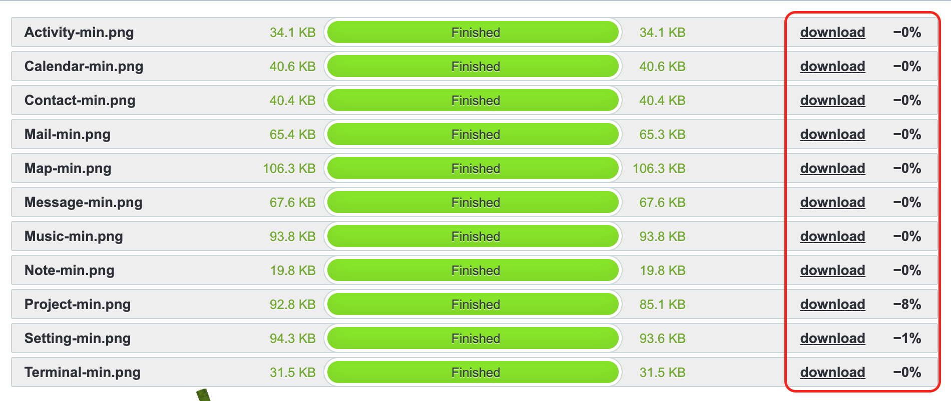 따라서 PNG 확장자를 사용한 대신, 이미지 최적화 툴을 통해 더이상 압축이 되지 않을 때까지 이미지 크기를 압축했습니다.