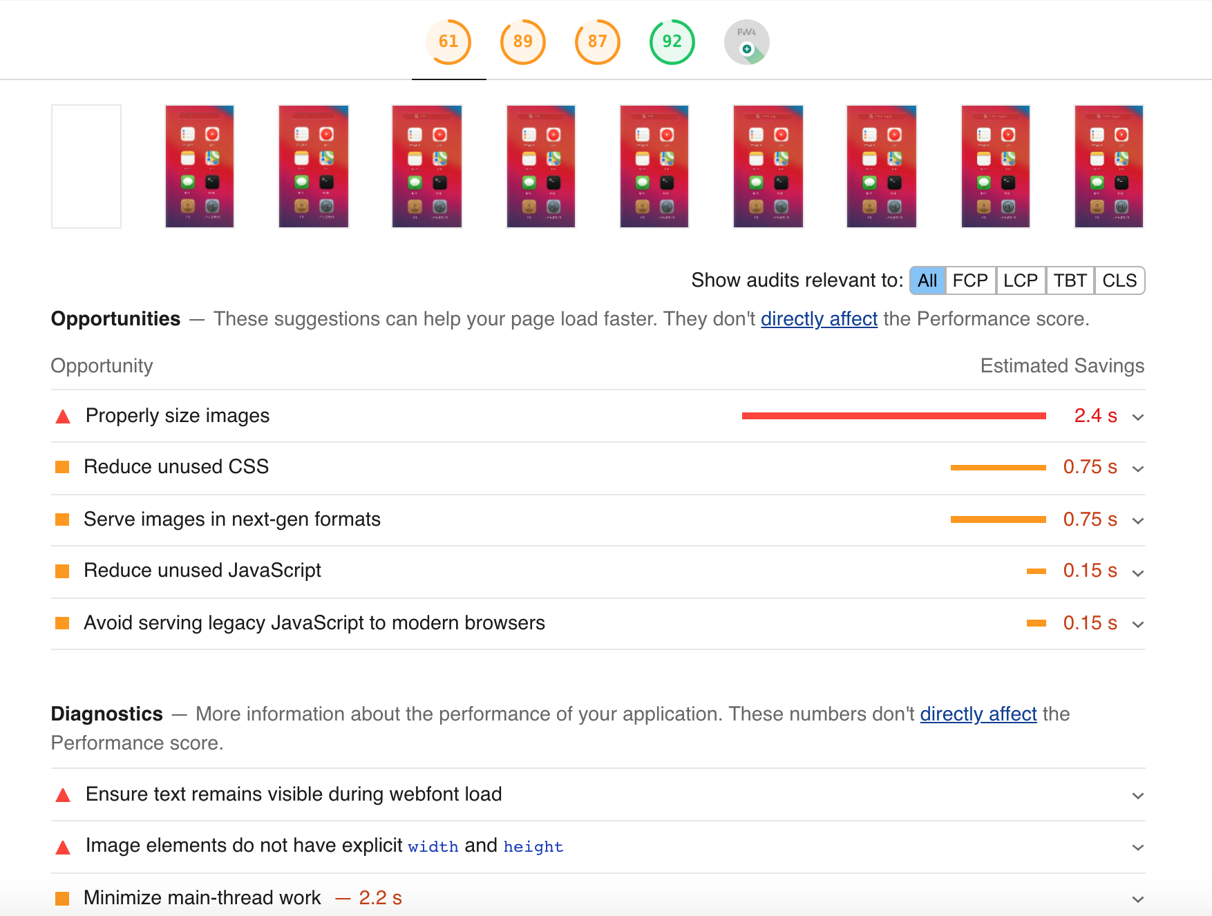 실제로 라이트하우스 보고서에서도 이 점 때문에 Time To Interactive 지표가 6.8초라는 처참한 결과를 출력했는데요, 그러던 와중 개선점으로 이미지 사이즈가 제안된 것을 보고 "아니 더이상 압축이 안된다니까, 무슨 사이즈를 말하는 거지?" 라고 또 화가 날 뻔했지만..!