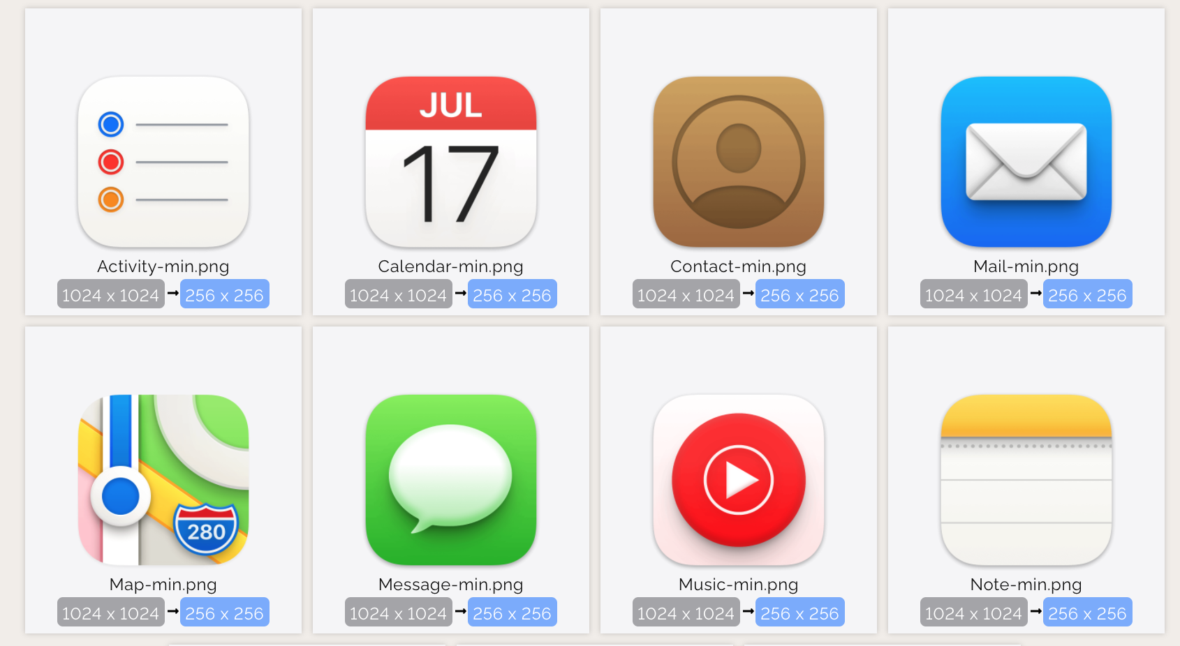 따라서 이 아이콘은 데스크탑에서 105px, 모바일에서는 94px이므로 해상도를 어느정도 유지하기 위해 256 * 256 규격으로 리사이징을 시도했고, 총 파일 용량을 50% 이상 줄일 수 있었습니다.