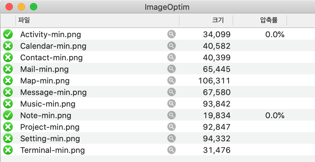 따라서 PNG 확장자를 사용한 대신, 이미지 최적화 툴을 통해 더이상 압축이 되지 않을 때까지 이미지 크기를 압축했습니다.