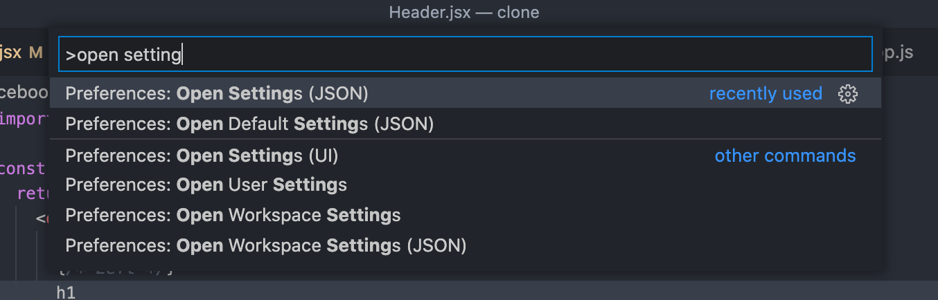 control + shift + p (Mac은 command + shift + p)를 누르면 실행할 수 있는 플러그인과 내장 속성이 나타나는데요, [open settings] 을 검색해 Open Settings (JSON) 메뉴에 진입합니다.