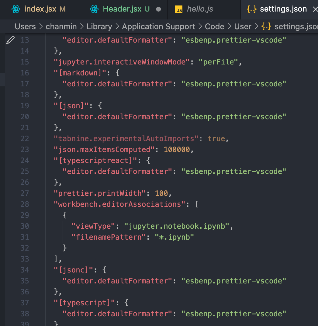 그러면 여러분의 vscode에 설정된 항목들이 JSON 파일로 출력될텐데 여기에 에밋을 허용하는 설정을 추가해주면 됩니다.