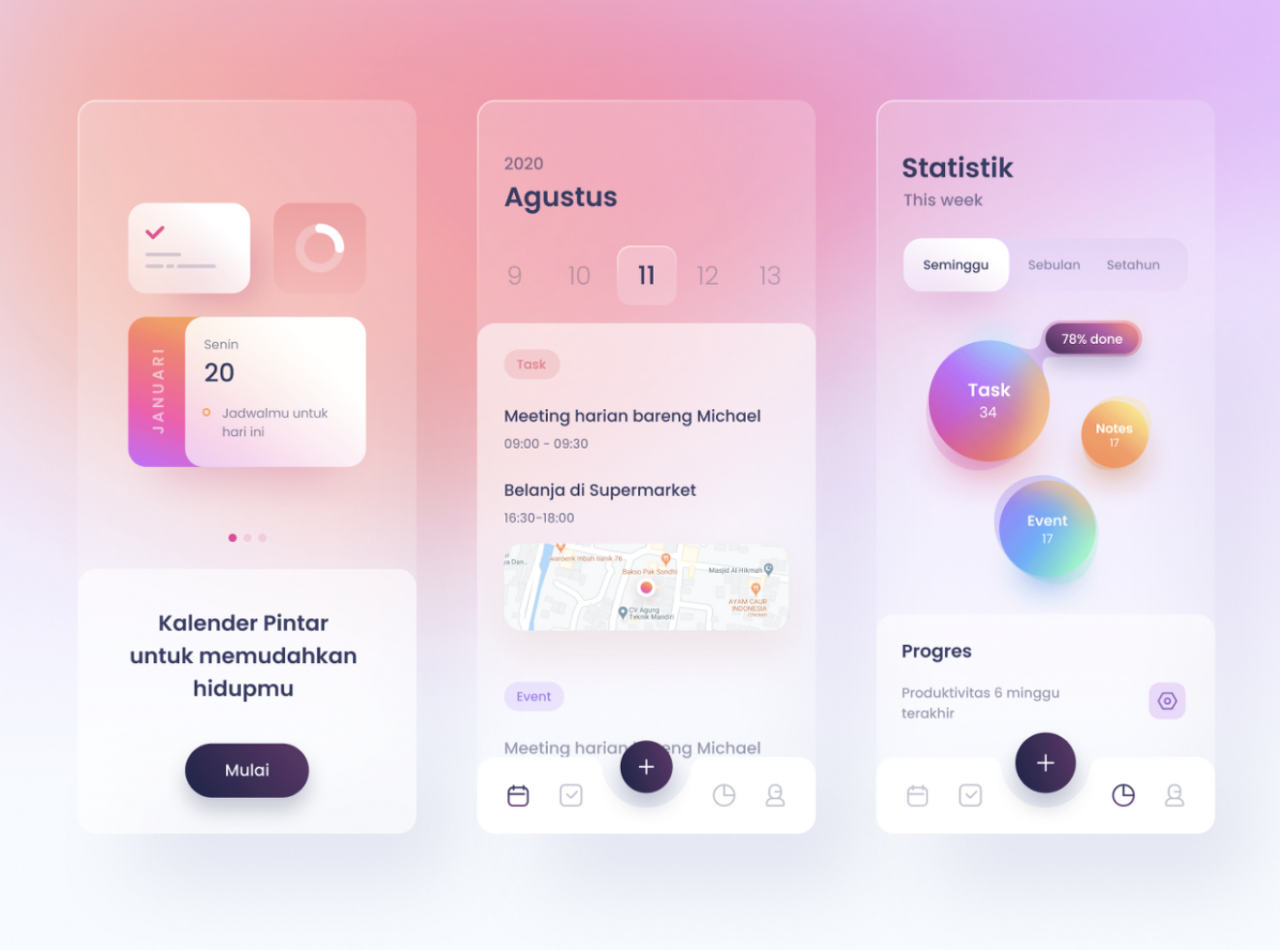 여러 스타일과 효과들의 특징을 가지는 모던 미니멀 디자인은 느낌을 적절히 확장하는 선에서 약간의 색을 입힌 그림자, 블러 효과를 추가한 오로라 배경, 엠보싱 및 글래스모픽한 느낌을 요소들에 적용합니다. 덕분에, 인터페이스의 시인성과 정돈성을 유지할 수 있습니다.