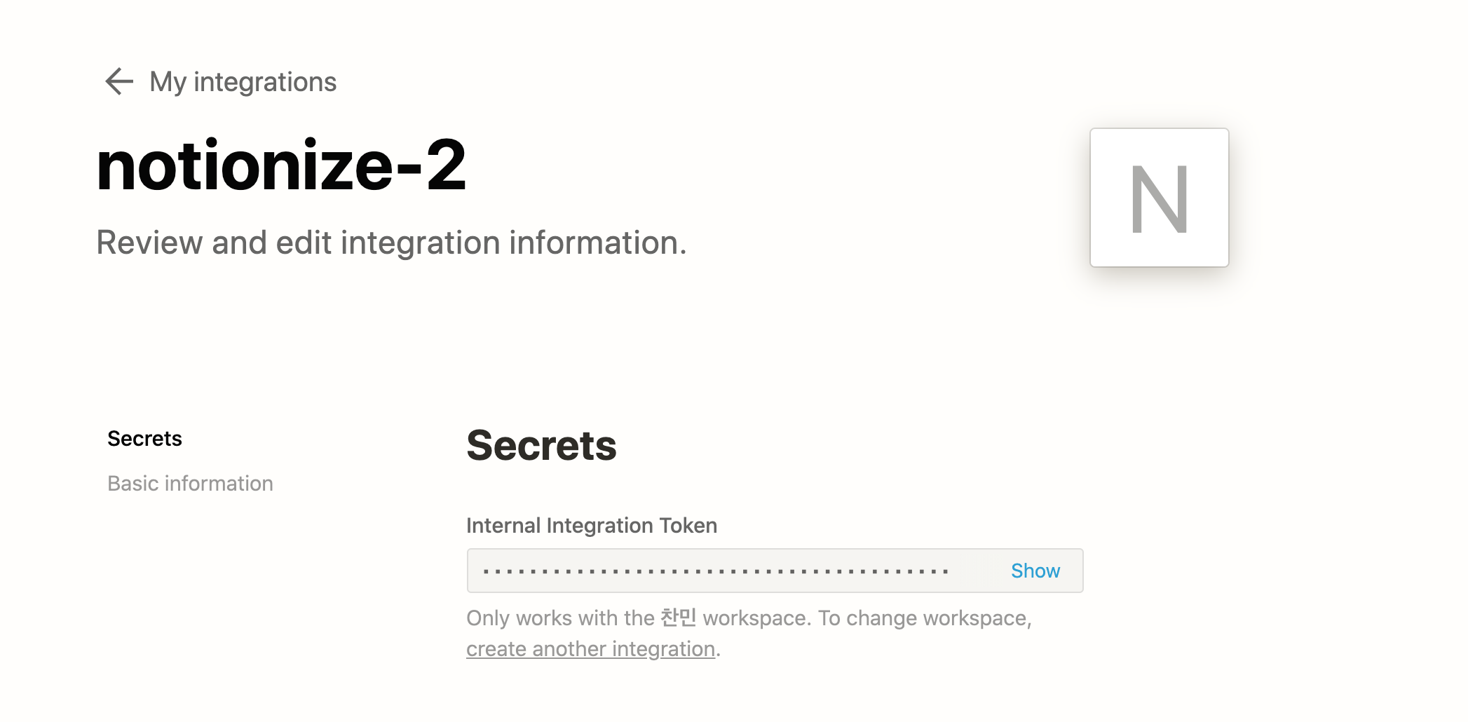 아직 베타 버전이다 보니 심플한 모습인데요, [Internal Integration Token] 을 복사해 사용하시면 됩니다.