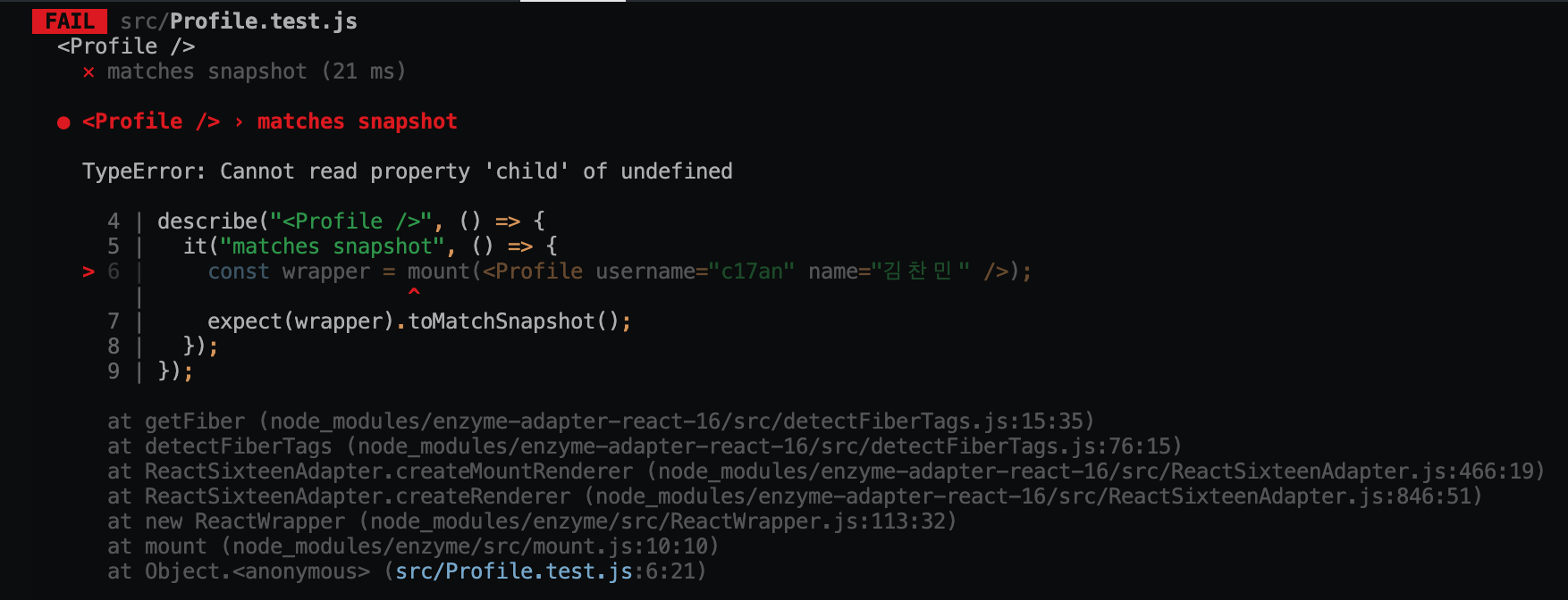 이슈 내용 : Enzyme 사용 시, mount 함수를 사용해 스냅샷 테스팅을 진행하면 TypeError: Cannot read property 'child' of undefined 오류가 출력됨.