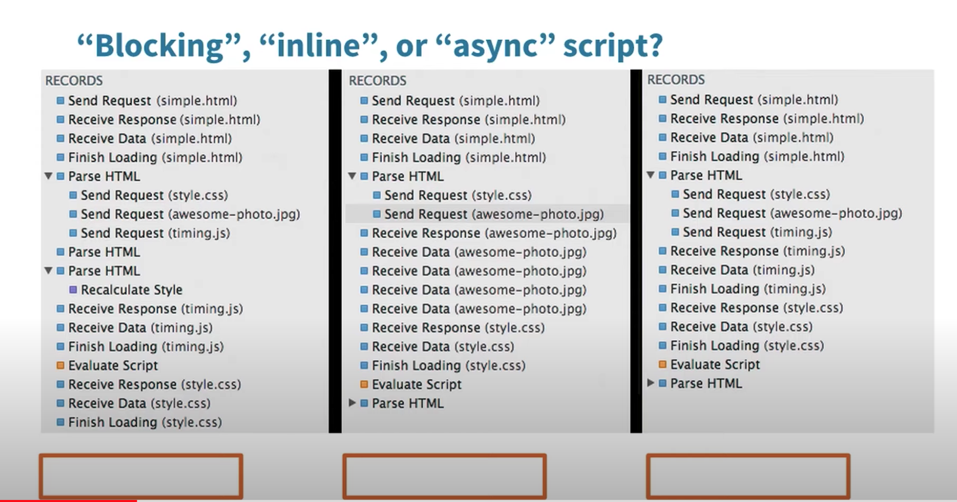 사진의 세 렌더링 프로세스는 각자 다른 방식으로 자바스크립트를 불러온 결과물인데요, 각 보기가 어떤 방식으로 스크립트를 불러온 것인지 맞히실 수 있으신가요? (인라인 스크립트 / 외부 스크립트 / async 외부 스크립트 중)