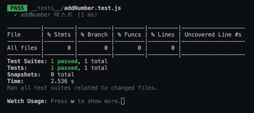 이제, jest --watch --coverage 로 테스트를 실행해 보겠습니다.