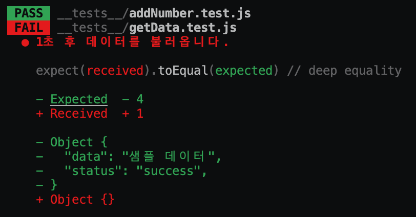왜냐 하면, 테스트 코드는 함수 안에서 비동기적인 작업이 수행된다는 것을 인지하지 못하고 getData(callback) 의 호출이 끝난 직후에 평가를 진행하기 때문입니다.
