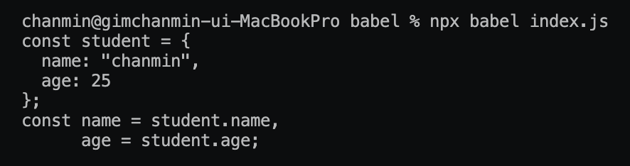 이제 다시 yarn(또는 npx) babel index.js 를 실행하면, 다음과 같이 분해 할당 문법의 트랜스파일이 완료됩니다.