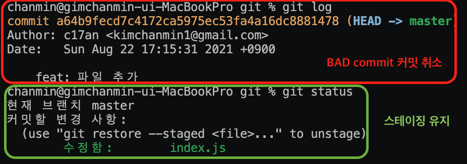 그리고 git log 로 다시 커밋 로그를 확인해보면, 변경사항은 유지된 상태로 커밋만 취소된 것을 확인할 수 있습니다.