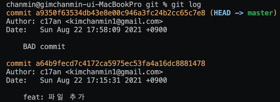 a9350f6 "BAD commit" 이라는 이름의 커밋을 취소하려면 먼저 git log 를 통해 커밋 로그를 확인합니다.