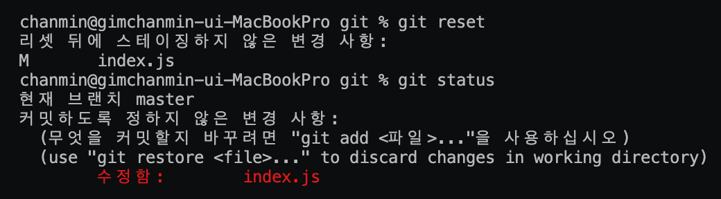 이럴 때는 git reset <언스테이징할 파일명> 으로 특정 파일의 스테이징을 취소하거나, git reset 커맨드로 모든 파일의 스테이징을 취소할 수 있습니다.