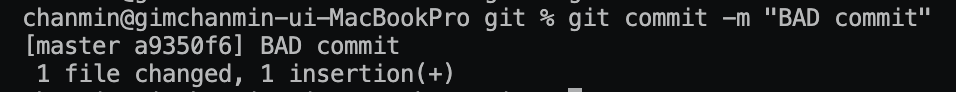 a9350f6 "BAD commit" 이라는 이름의 커밋을 취소하려면 먼저 git log 를 통해 커밋 로그를 확인합니다.
