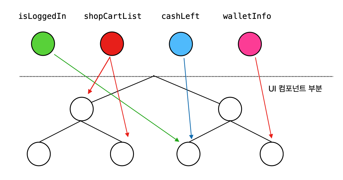 한번 인증 정보, 상점의 물품 정보, 내 지갑 정보를 상태로 관리하는 어플리케이션이 있다고 가정하겠습니다.