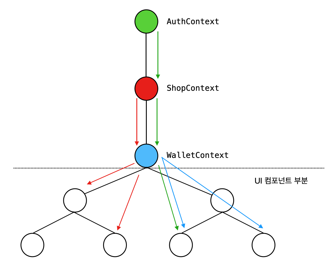 현재는 컨텍스트가 3개만 존재하기에 별로 문제가 없을 수도 있지만, 컨텍스트가 수십개로 늘어나게 되면 갈수록 여러 계층을 거치게 되며 성능 저하가 일어날 여지가 있습니다.