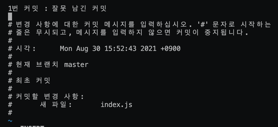 커맨드를 입력하면 직전에 남긴 커밋 메시지를 수정할 수 있도록 텍스트 에디터가 나타나고, 커밋 메시지를 수정하면 새로운 커밋의 추가 없이 커밋이 수정됩니다.