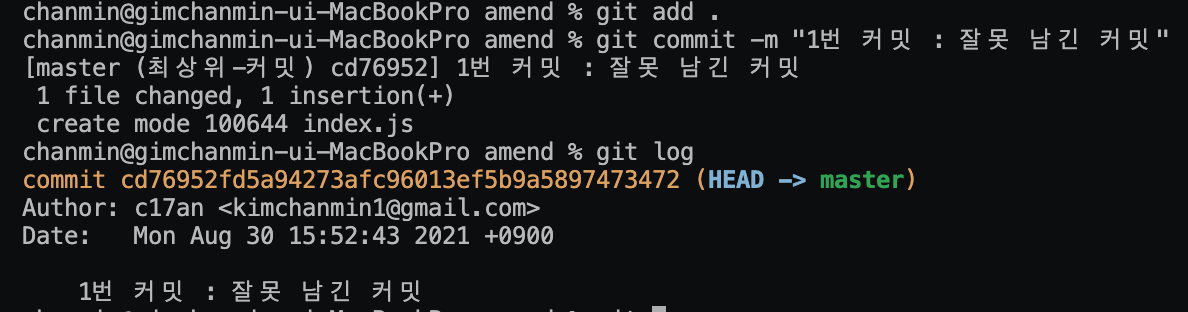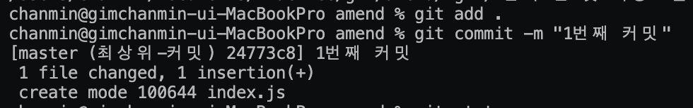 git commit 커맨드에 --amend 플래그를 붙이면 직전에 남긴 커밋을 수정할 수 있게 됩니다.