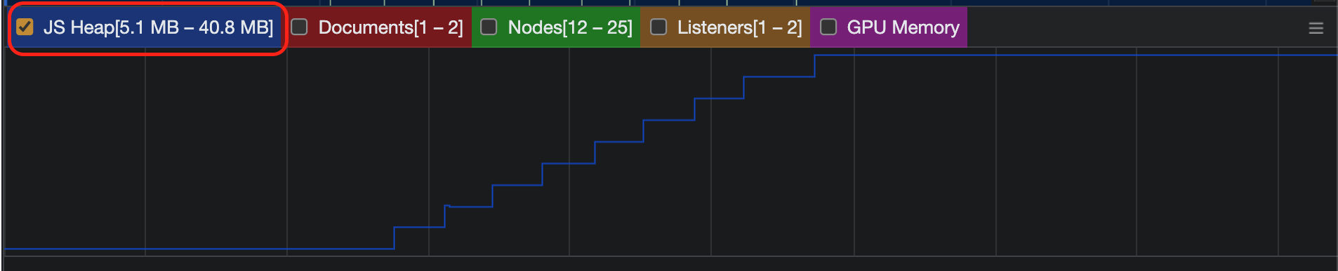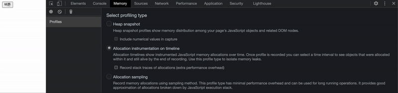 버튼을 누를 때, 처음 한번만 메모리에 참조값이 할당되고 더이상 새로운 메모리를 차지하지 않는 모습입니다.